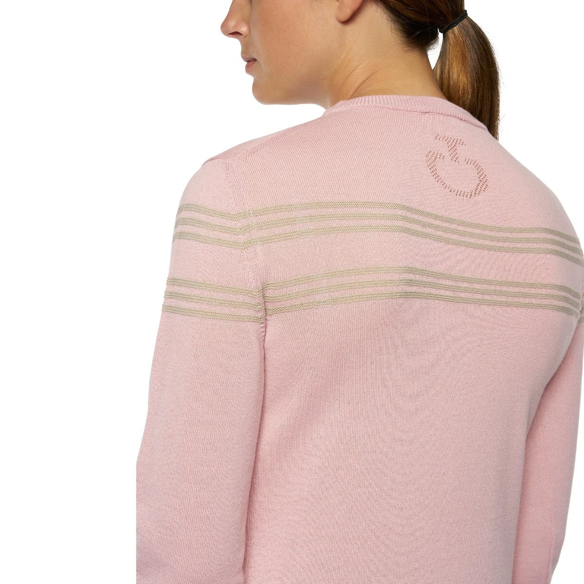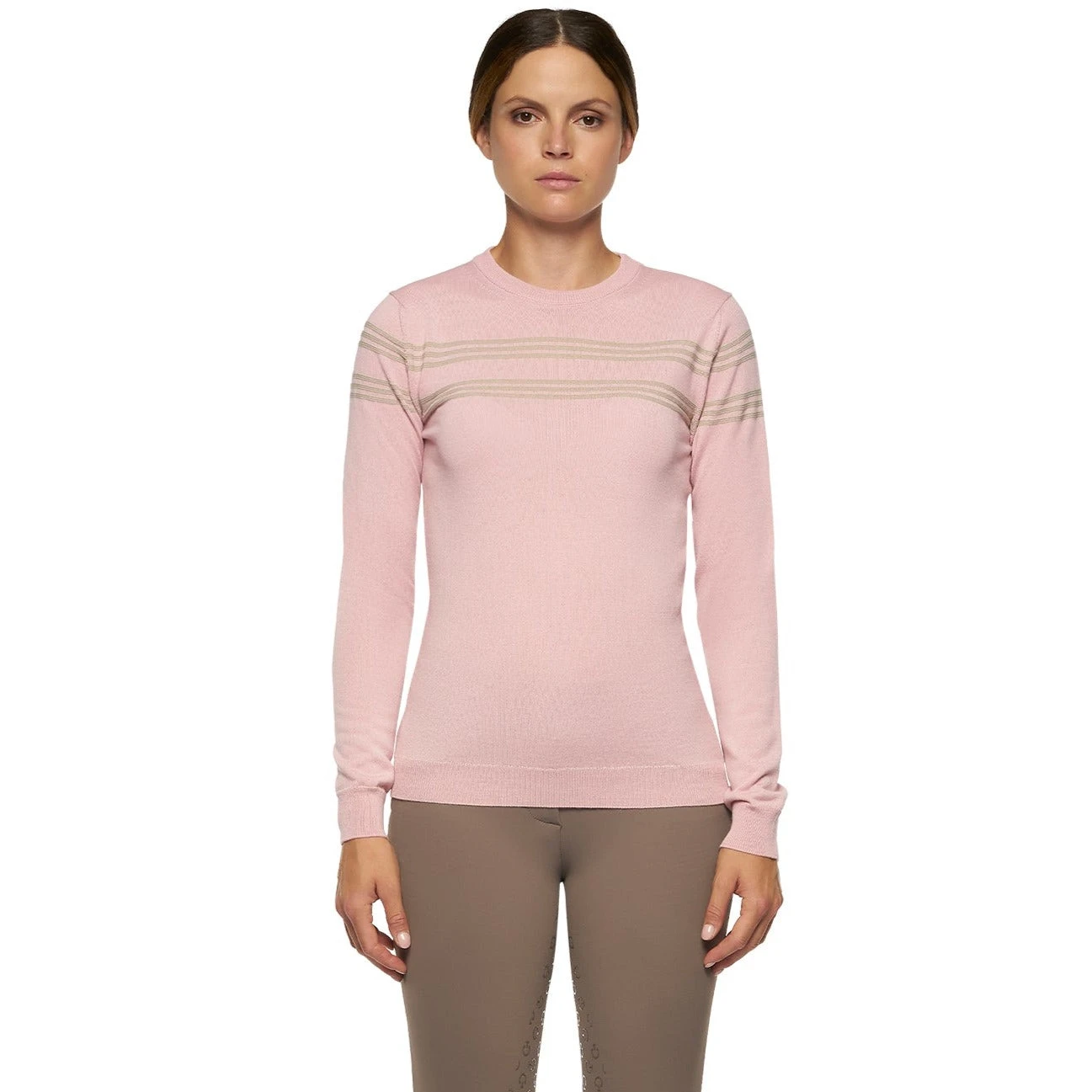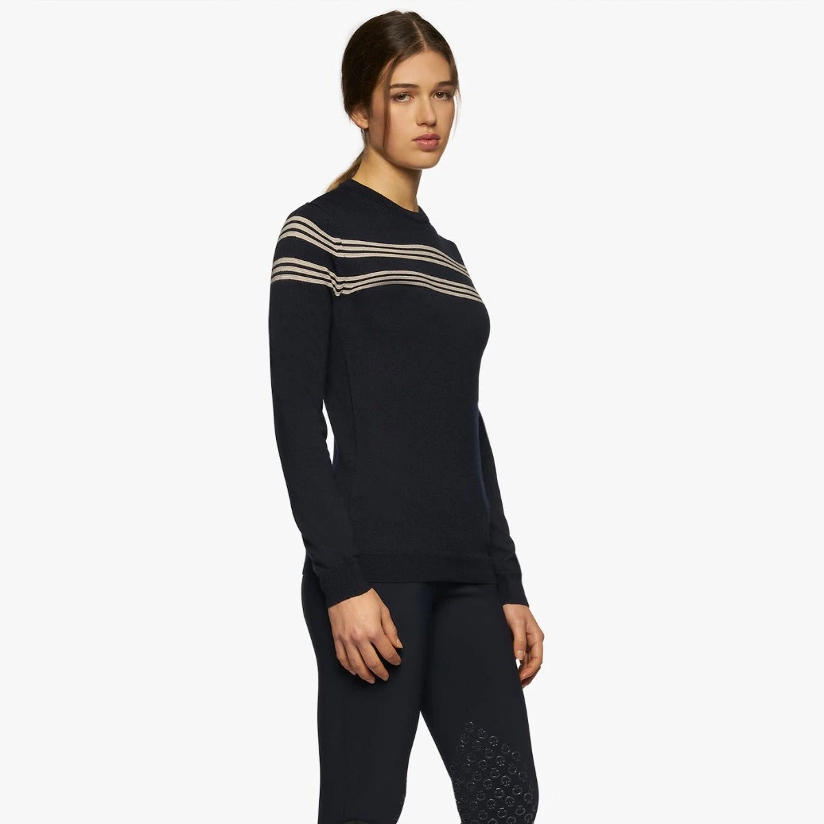 Women’s merinos blend crew neck striped knit sweater.