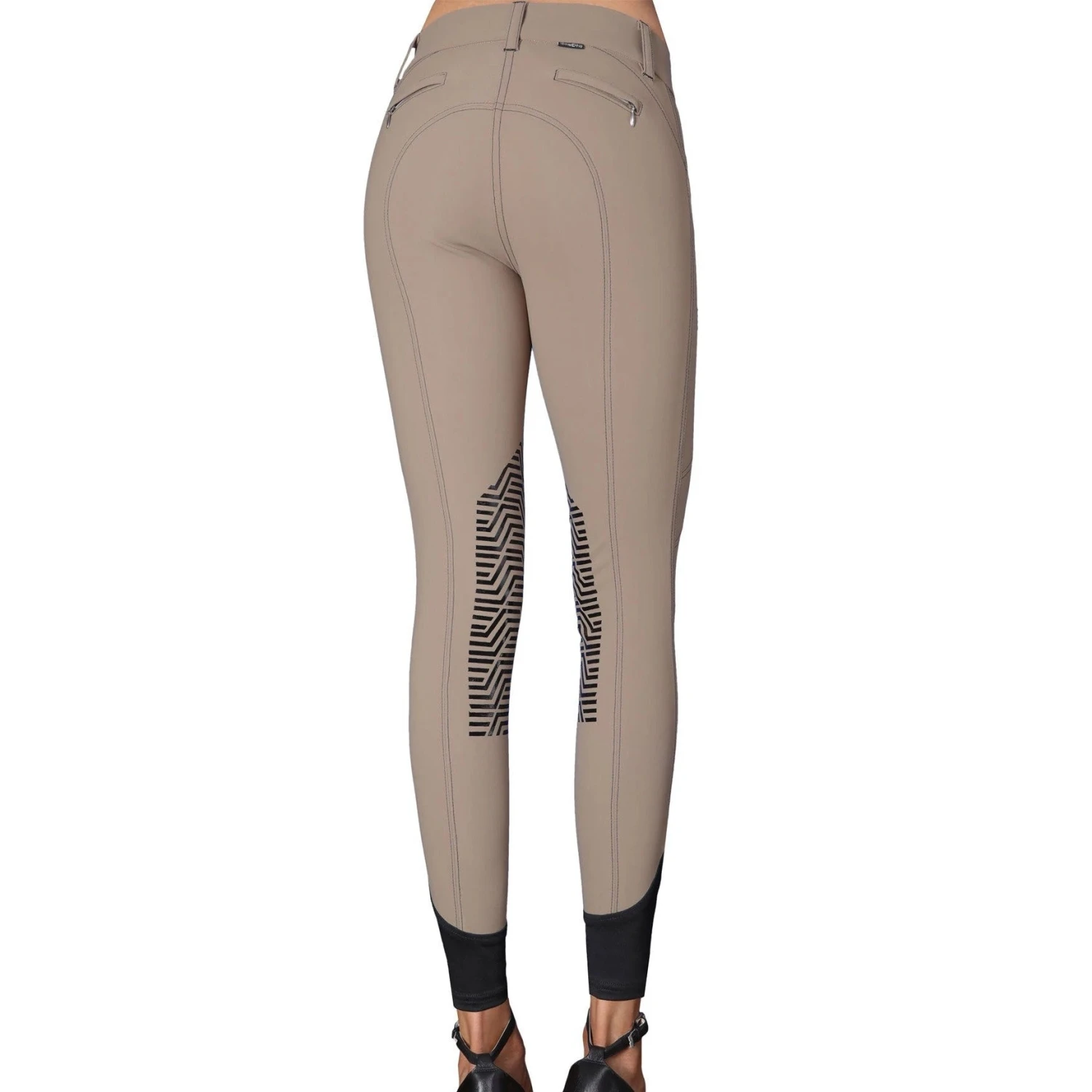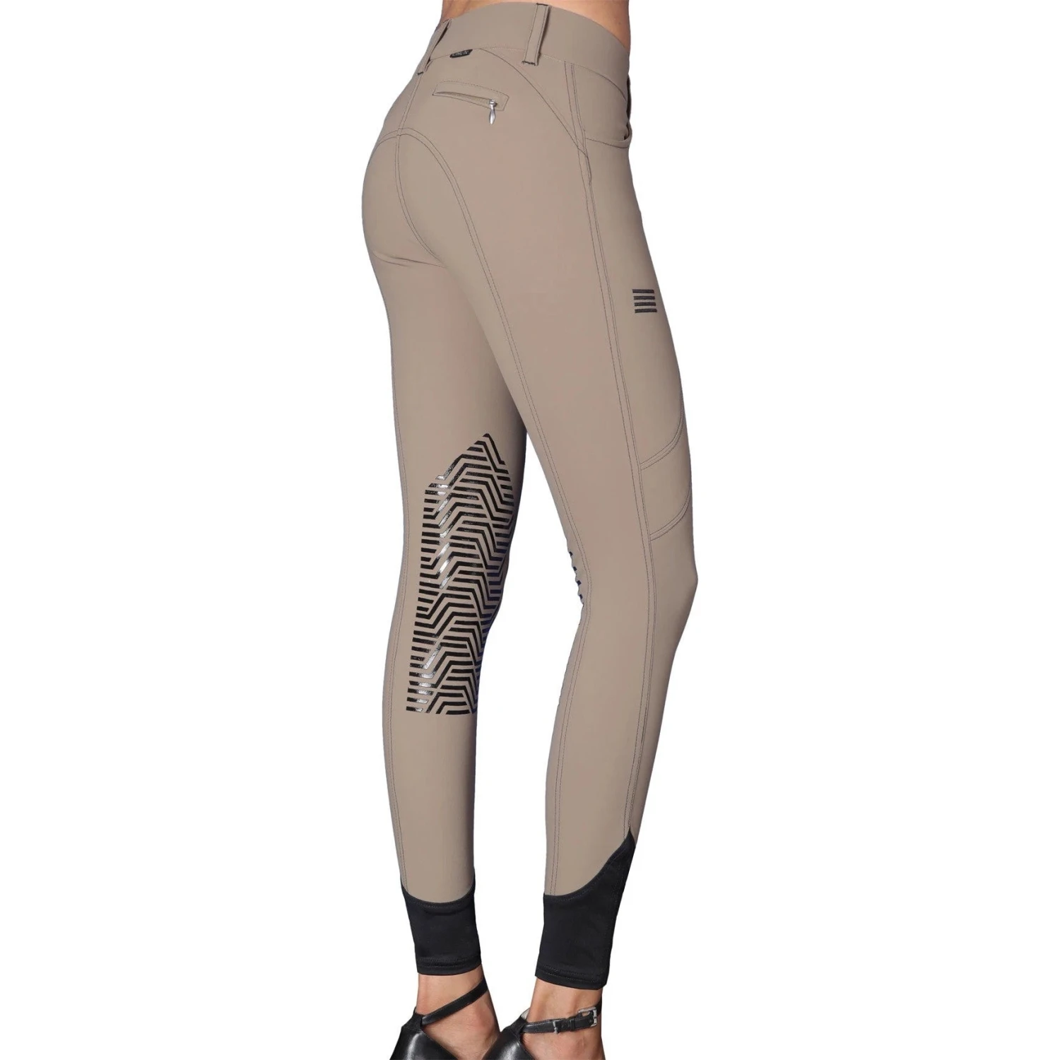 This breech features ultra figure flattering seaming and piping details, grippy geometric silicone knee patches, a soft flexible knit leg cuff for a form fitting feel under your riding boots, and Ghodho signature logo embroidery.