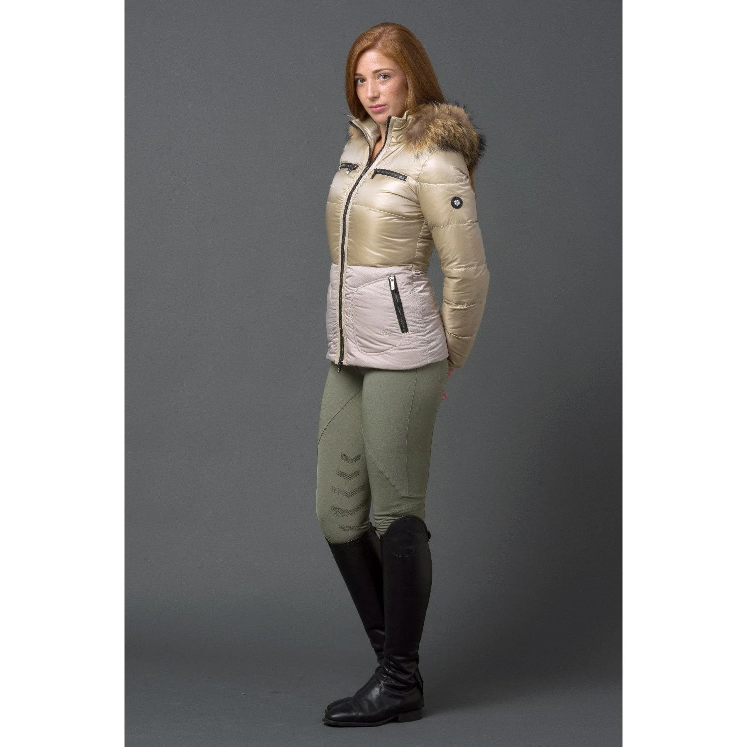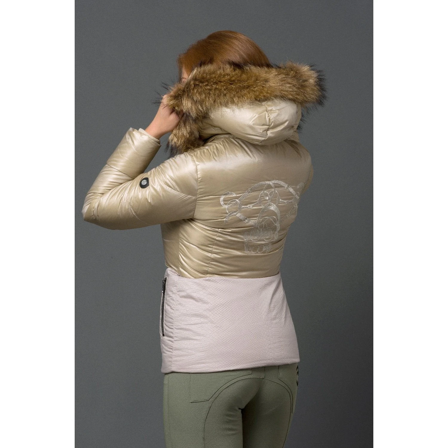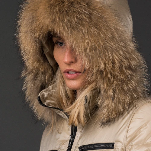 The Lucie padded jacket produced by Joshua Jones UK has the style and design to keep you delightfully warm and comfortable. This beautiful jacket is tailored at the waist. A jacket for all occasions, night or day, you really will can’t go wrong with this elegant item in this beautiful champagne colour. Duck down and very warm, trimmed in racoon fur. Accessories to match the gorgeous fur trim in silver, with a contrasting snakeskin print material bottom.